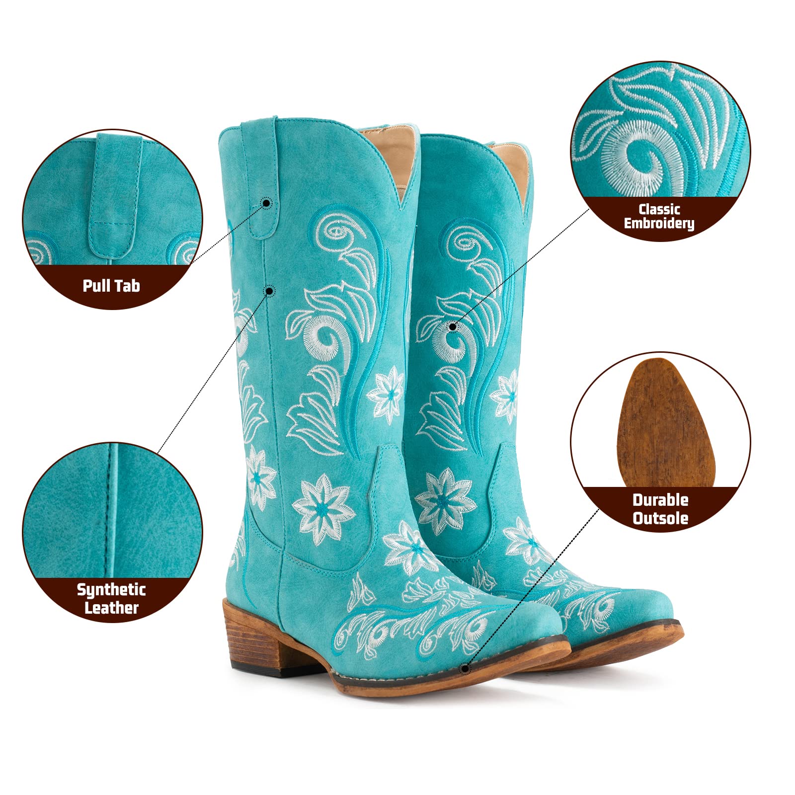 IUV Cowboy Boots For Women Mid Calf Cowgirl Boots Embroidered Pull-On Tabs Snip Toe Boot